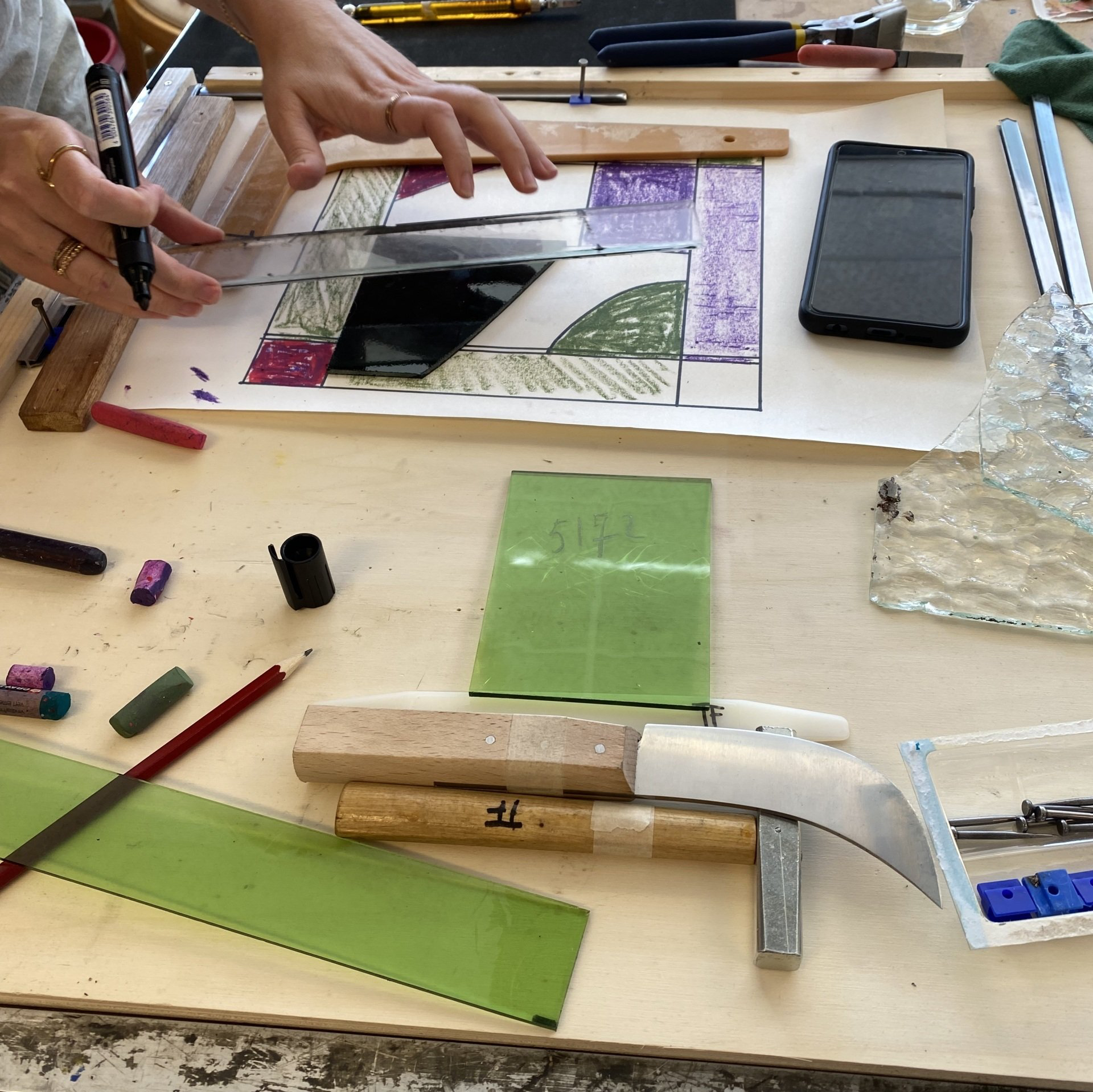 Je begint met een eigen ontwerp, je leert glas snijden, glas in het lood zetten en solderen.